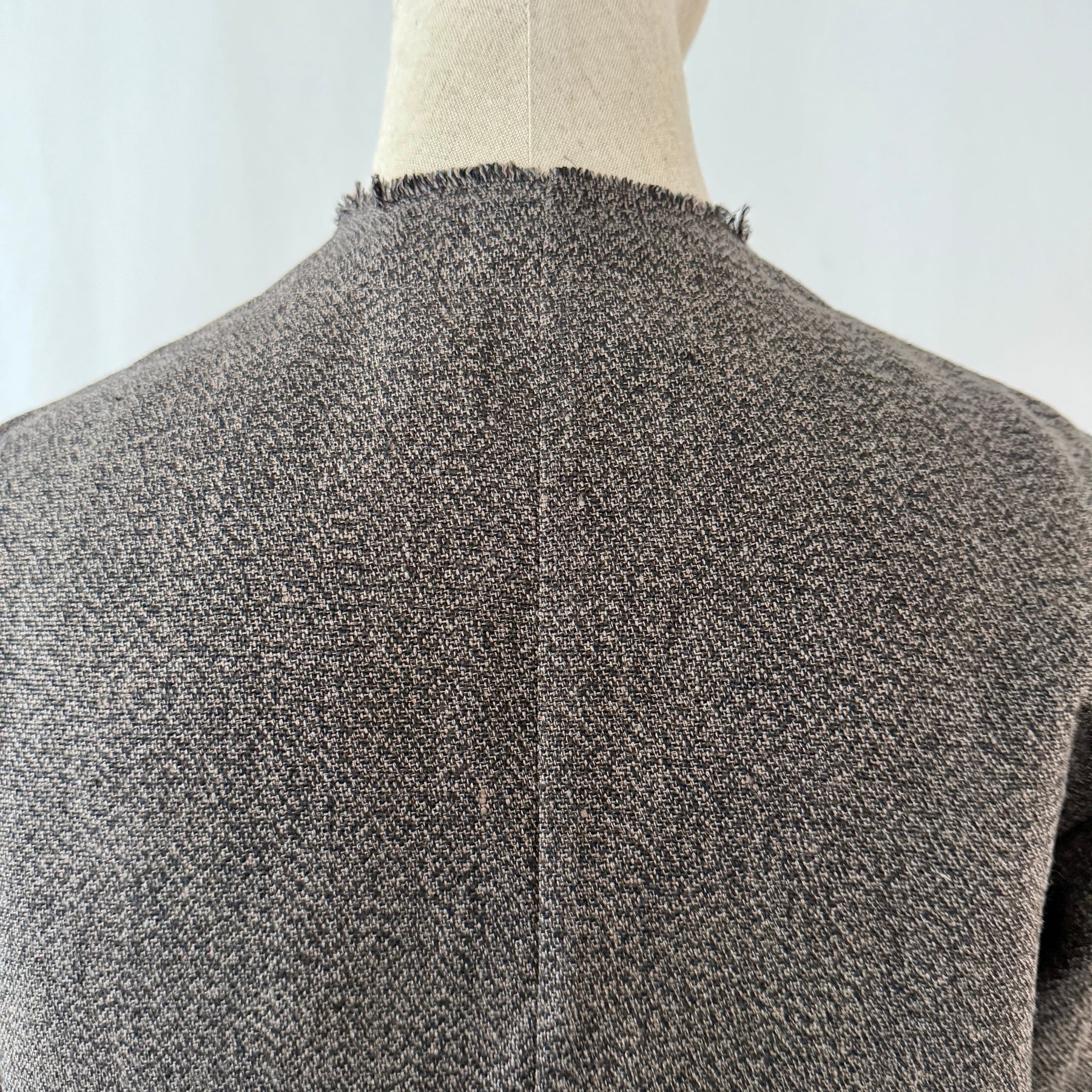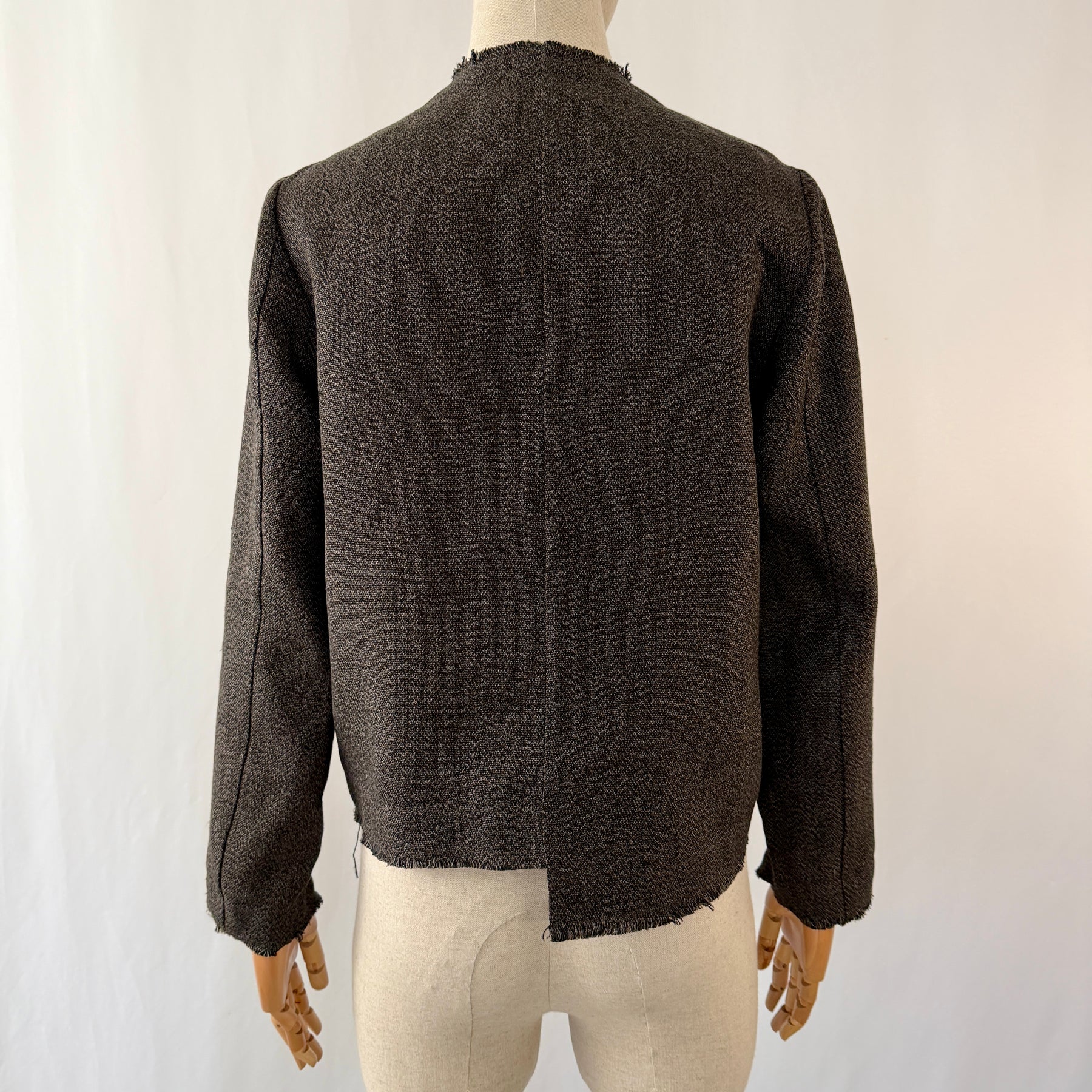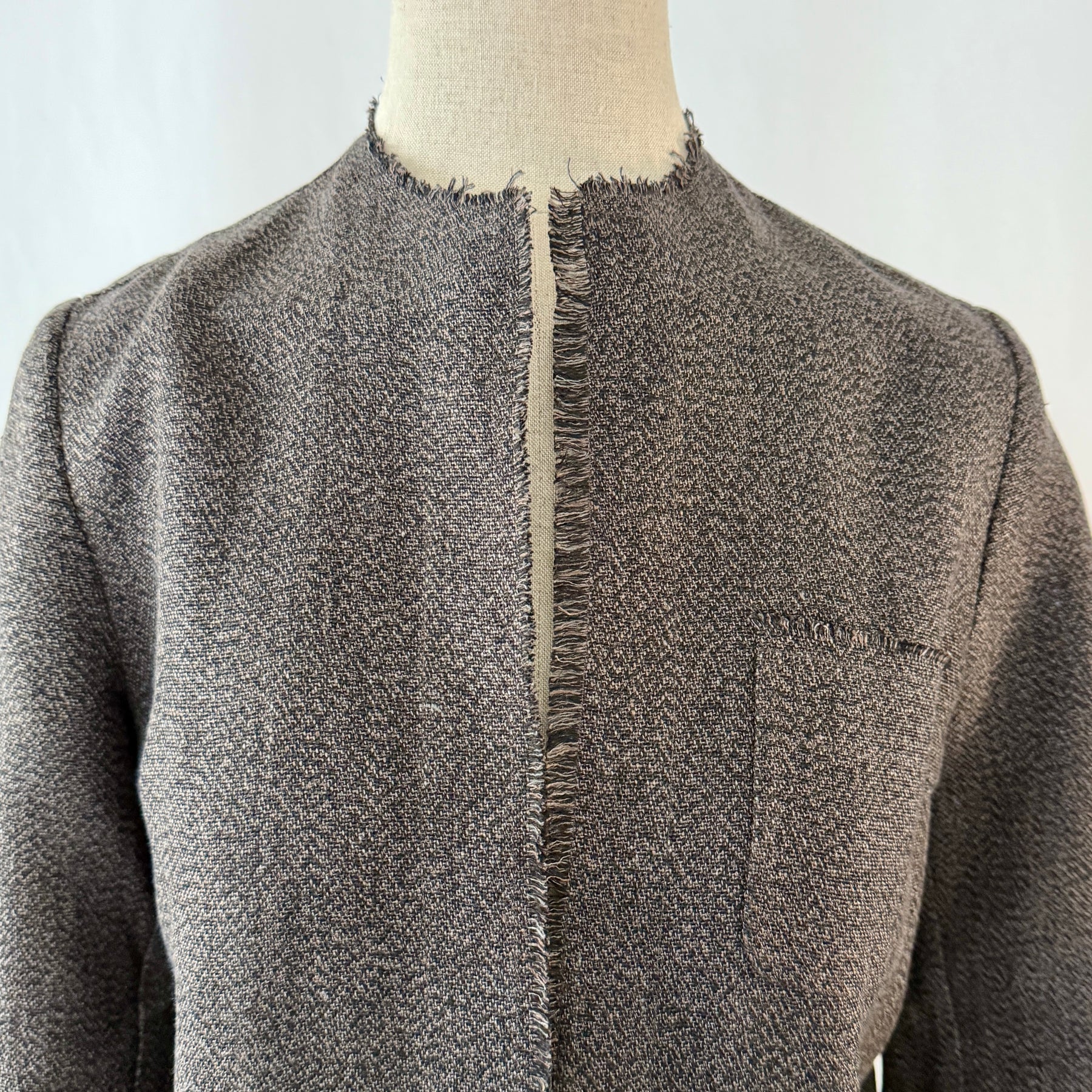Linen melange jacket featuring round neck, raw cut edges and patch pocket on chest. Unlined and detailed with inner contrasting grosgrain trims. No closure.